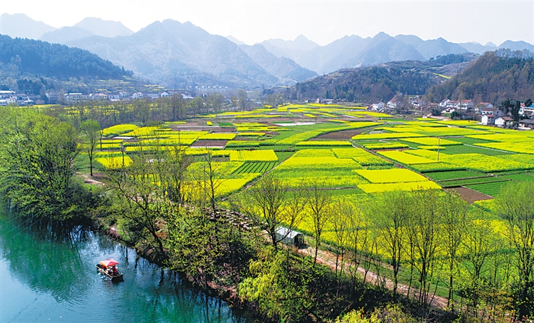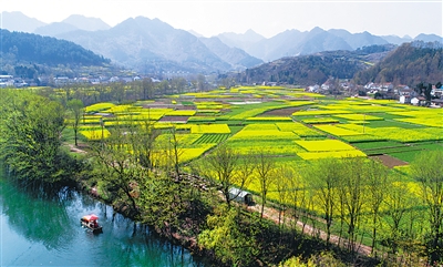 3月22日,游人在汉中市勉县元墩镇喇家寨社区游览(无人机拍摄)。近日,陕西省汉中盆地绵延万顷的油菜花盛开,黄色的油菜花与绿色的麦苗交相辉映,美不胜收。 新华社发