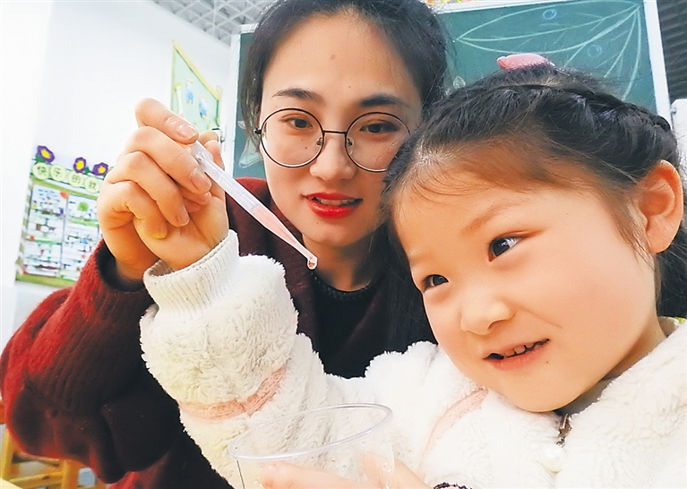3月22日,江苏省连云港市连云区海州湾中心幼儿园的小朋友在老师指导下观察一滴水的形状。