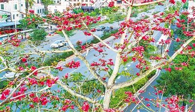 近日,在海口市红城湖路延长线上,木棉花竞相绽放,吸引鸟儿落在枝头栖息、追逐。本报记者 张茂 摄
