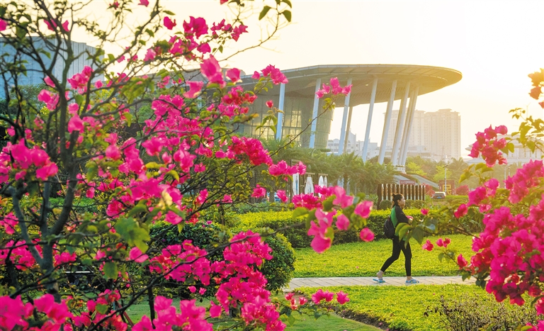 3月21日,在海口市国兴大道省文体公园内,三角梅竞相吐艳,不少市民来到公园内散步,欣赏花景。本报记者 宋国强 摄