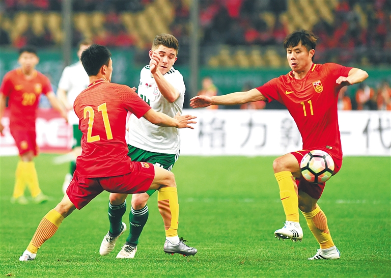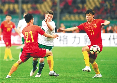3月22日晚,2018中国杯国际足球锦标赛中国队对威尔士队比赛在广西南宁体育中心举行,最终国足0:6告负,威尔士头号球星贝尔上演“帽子戏法”。图为国足球员蒿俊闵(右一)在比赛中拼抢。 新华社记者 周华 摄