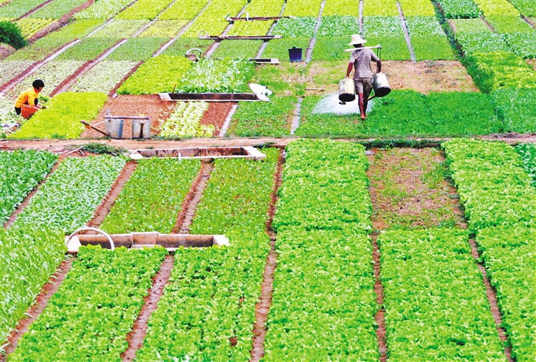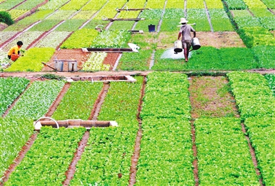 三亚市田独镇田洋里,农民正在人工浇灌蔬菜(摄于2004年2月)。 本报记者 张杰 摄