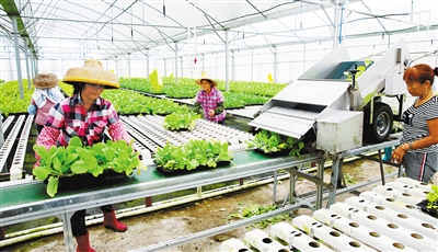 海南绿普生农业科技有限公司三江蔬菜基地,员工正在运用机械采收穴盘有机鸡毛菜(摄于2017年7月)。本报记者 苏晓杰 摄