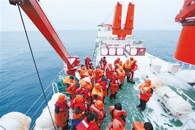 3月22日,正在南极阿蒙森海开展海洋综合调查的中国第34次南极科考队在“雪龙”号极地考察船上举行应急消防弃船演练。 新华社发