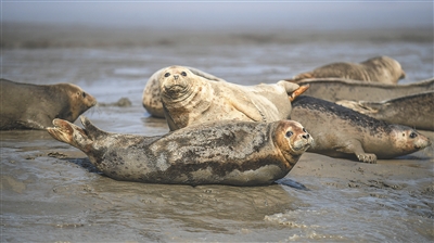 近日,辽宁盘锦双台河口三道沟海域滩涂上出现大批洄游栖息的斑海豹。据了解,每年2月到5月,成群的斑海豹都会洄游至辽河入海口处活动。目前在双台河口附近海域约有300余头斑海豹,这些斑海豹将在此处海域栖息至5月中旬,随后它们将逐渐离开辽东湾。新华社发