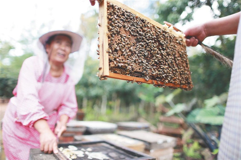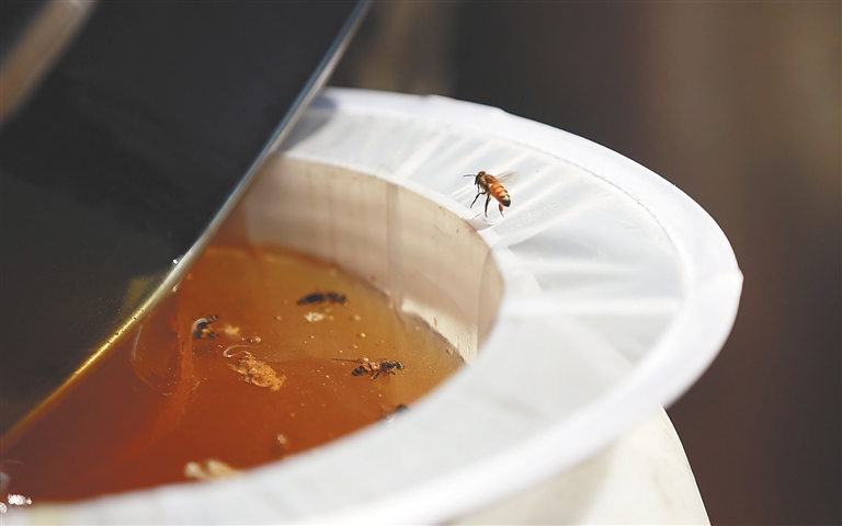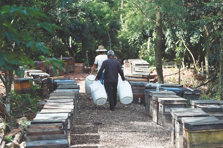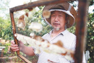 3月中旬,记者在石山镇的荔枝林里遇到宫志国时,一家人正在割蜜。700多个蜂箱在地上摆放整齐,蜜蜂进进出出忙着采蜜。戴上蜂帽,打开蜂箱,先用香熏一熏,把蜜蜂熏出来,然后小心地把一页页蜂篦抽出来。篦子上密密麻麻爬满了蜂,抖几下,用刷子把蜂赶下来,把篦子放到采蜜机上转两圈,机器里就满是金黄浓稠的蜜汁。