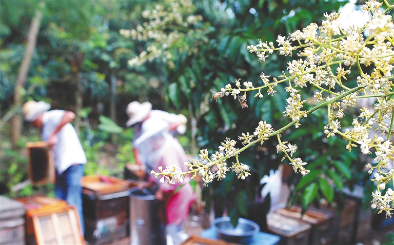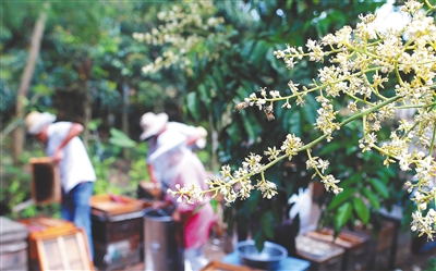 3月,海口羊山地区的荔枝花开了,漫山遍野花香,农家蜂箱花蜜开始溢流。竞相盛开的荔枝花也吸引了来自全国各地的近千名职业“追花人”,其中就包括已连续10年来海口采蜜的宫志国、宫利文父子俩。