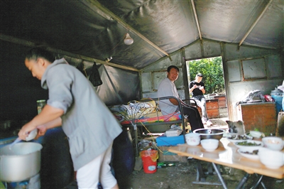 宫志国的“帐篷”是铁皮搭成的。走进去,地面就是裸露的红土,杂草丛生。中间摆着双人床和木桌,还有电视、冰箱,左边角落里摆着煤气罐,锅碗瓢盆和调料应有尽有。“帐篷”里不仅夏热冬冷,遇到下大雨,住所的安全也成问题。