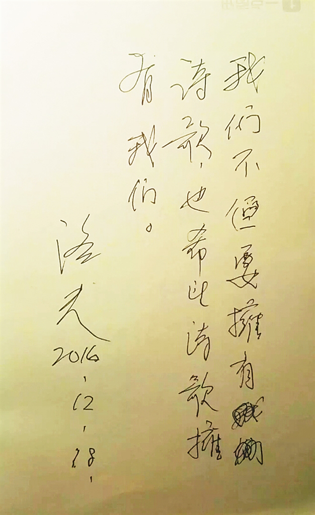 雁西回忆说,当洛夫先生为我写下“我们不但拥有诗歌,也希望诗歌拥有我们”的寄语时,我还不甚理解,近日我才真正悟出:“只有写出优秀诗歌的人,才值得被诗歌拥有。”