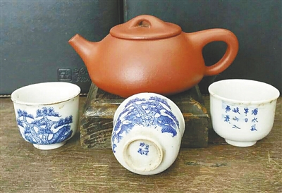 小紫砂壶可称“孟臣”,却并非“孟臣”,但为它配备3个“若深”小杯,倒也别有一番韵味。“若深”最早见于康熙年间古陶瓷专著《杯史》,民国时,许之衡《饮流斋说瓷》称:若深珍藏为康熙制品。潮汕茶客常以白地蓝花、底平口阔、杯底书“若深珍藏”的“若深杯”为珍贵。广西知名藏家陈世俊先生研究过三只杯的胎釉、纹饰,认可它出自康熙年间的景德镇窑。