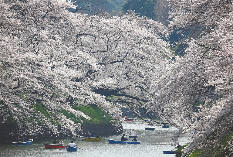 3月26日,在日本东京的千鸟渊,游人划船赏樱。 新华社/路透