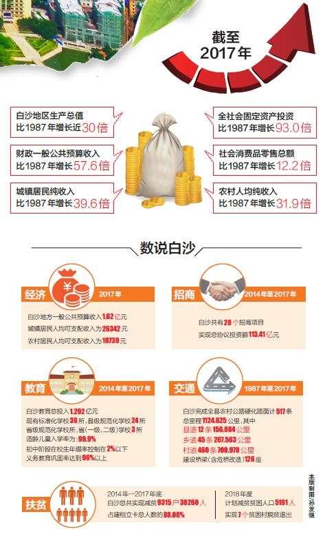 30年来,白沙跟随海南经济社会快速发展的脚步拿出了合格的发展成绩单:2017年,白沙地方一般公共预算收入1.62亿元,比1987年775万元增长了57.6倍;2017年城镇居民人均可支配收入达到2.6342万元,比1987年增长了39.6倍;农村居民人均可支配收入在去年达到1.0739万元,比1987年增长了31.9倍……