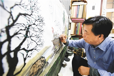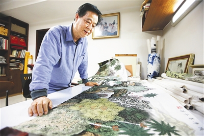 3月15日,在海口的工作室内,画家邓子芳认真地创作还未命名的新画作,宣纸上有挺拔的椰树、远处的小船、松软的海滩,色彩斑斓、布景繁密。一幅滨海人家、春意盎然的风景图跃然纸上。“这就是我所画的滨海人家一景,春天的海南,遍地生机,充满力量。”今年70岁的邓子芳,仍在宣纸上绘画着他心中的海南风光。在他的工作室内,抬眼所见的作品无不以海南的风光为主题,可见他对这片土地的炽热感情,而他的画作,也多数以展现别样的海南风光气韵而闻名,激发了观赏者对南国风光的向往,也让别人认识了一个全新的海南。