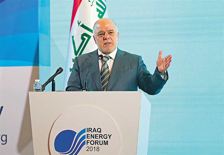 3月28日,在伊拉克巴格达,伊拉克总理阿巴迪在伊拉克能源论坛上发表讲话。