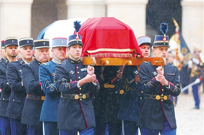 3月28日,在法国巴黎,法国军人护送阿诺·贝尔特拉姆的灵柩。