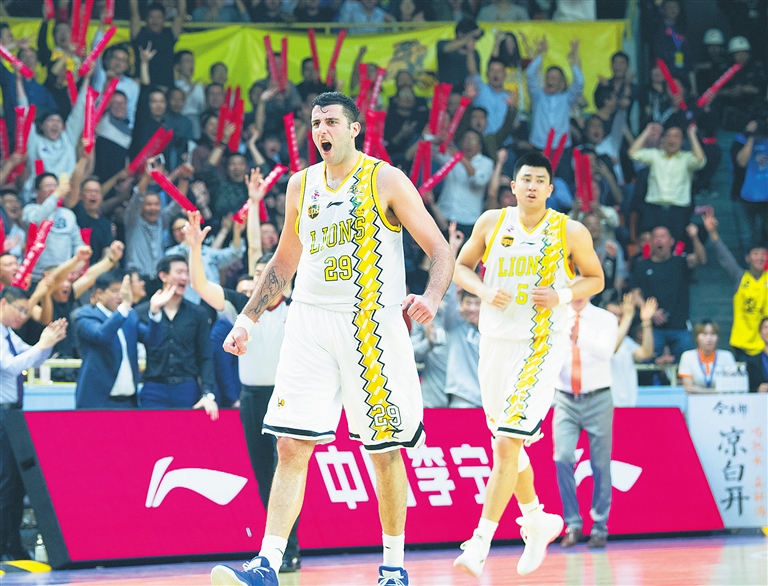 3月28日晚,CBA半决赛开战。在首场比赛中,浙江广厦队主场以128:118战胜山东高速队。图为广厦队外援博洛西斯(左)庆祝得分。新华社发