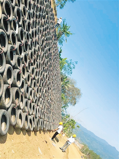 “这一片边坡都是利用废旧轮胎做成的,大概用了上千个。”琼乐高速琼中至五指山段代建指挥长汪劭祎告诉记者,传统的高速公路边坡大多用石料砌成,以防止滑坡;而将废旧轮胎绑扎在一起,再填土种草,“不仅固土效果好,关键是实现了废旧材料再循环利用,节约和保护了环境资源。”