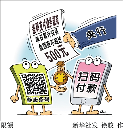 中国人民银行发布的条码支付业务规范4月1日起实施。规范明确,若使用静态扫码支付,同一客户银行或支付机构单日累计交易金额应不超过500元,使用动态扫码支付的最高不限额。