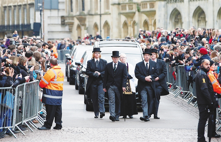 3月31日,在英国剑桥,葬礼车队抵达圣玛丽教堂。当日下午,已故英国科学家霍金的葬礼在剑桥大学的圣玛丽教堂举行。霍金的家人、同事和朋友等约500人出席了这个私人纪念活动。 新华社/路透