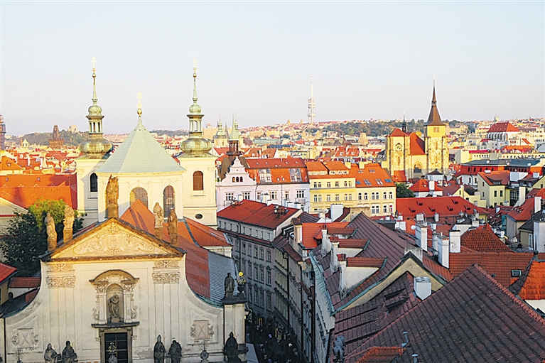 在查理大桥的塔桥顶上俯瞰布拉格,无数形态各异的塔尖会让你明白“千塔之城”这个名称的由来,而高低错落的红屋顶黄墙壁会让你知道“金色城市”不是徒有虚名。