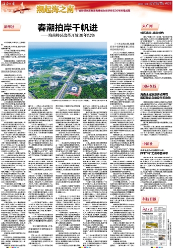 | 海南日报 潮起海之南 省外媒体聚焦海南建省办经济特区30年辉煌成就 003 2018-04-021 2018年04月02日 星期一 |