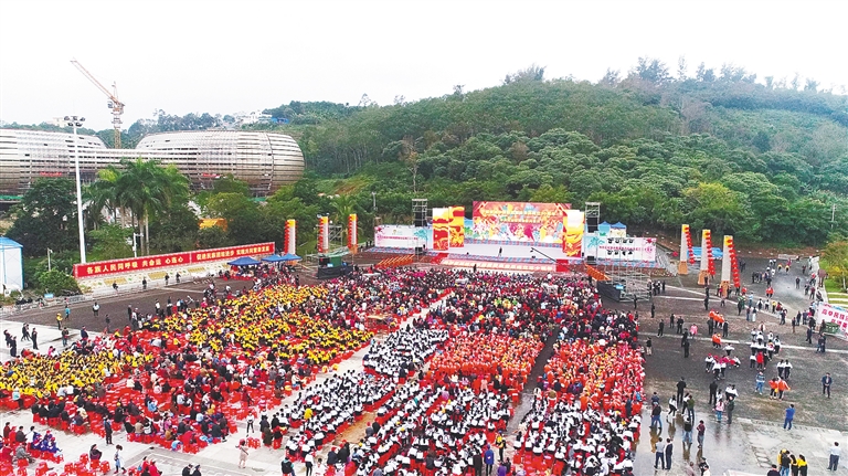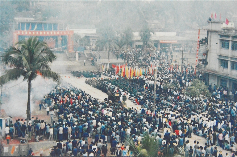 1987年12月28日,黄雪平和朋友相约到琼中百花岭风景区采风,途经琼中黎族苗族自治县人民政府办公大楼时,被眼前的热闹景象吸引,用手中的快门记录下了难忘的一幕。