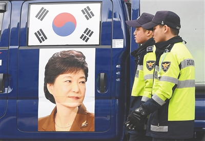 4月6日,在韩国首尔,两名警察经过韩前总统朴槿惠的照片前。韩国首尔中央地方法院6日对前总统朴槿惠“亲信干政”案进行一审宣判,判处朴槿惠24年有期徒刑,并处罚金180亿韩元(约合1.06亿元人民币)。 新华社/法新