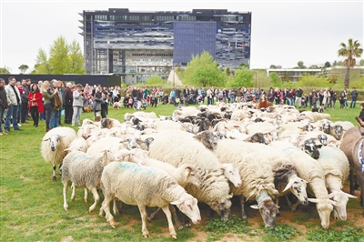 4月7日,在法国蒙彼利埃,人们在进城吃草的羊群旁围观。法国通过“生态放牧”项目让羊群进城市草地吃草来替代割草机,羊群遗留的排泄物还有助于提高城市绿地的生物多样性。新华社发