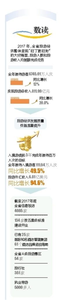 快速增长的数据是海南开拓国际旅游市场的有力见证:2017年全年接待入境游客111.94万人次,同比增长49.5%,旅游外汇收入6.81亿美元,同比增长94.6%,入境游提前3年完成年接待百万人次的目标,海南国际旅游岛入境旅游发展取得阶段性突破!