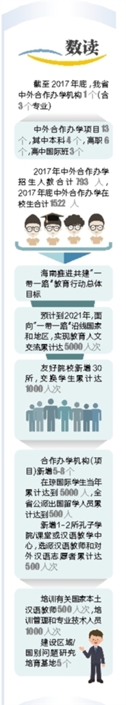 “海南在‘一带一路’”建设推进过程中,肩负历史责任和担当。作为一项系统工程,民心相通是基础,教育是其中不可或缺的重要部分。”该负责人说,海南推进共建“一带一路”教育行动的“小目标”正一个接着一个地实现着。预计到2021年,我省将面向“一带一路”沿线国家和地区,实现教育人文交流累计达5000人次,培训有关国家本土汉语教师500人次、管理和专业技术人员1000人次。同时,建设区域/国别问题研究培育基地5个,为国家制定发展战略、政策措施提供智力支持、决策咨询、理论探讨和实践分析。