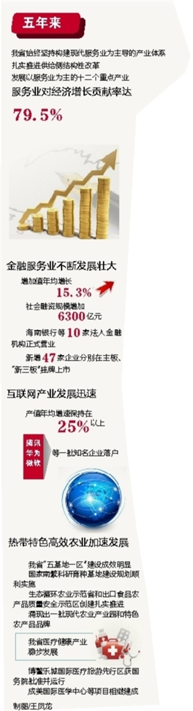 回眸这些年深化供给侧结构性改革进程,海南始终把着力点放在壮大实体经济上。坚持构建现代服务业为主导的产业体系,扎实推进供给侧结构性改革,重点发展以现代服务业为主的十二个重点产业。2017年,服务业对经济增长贡献率达79.5%,十二个重点产业增加值同比增速达10.1%,占经济总量超7成。