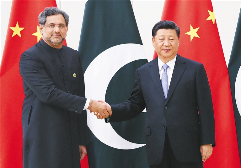 习近平指出,我2015年访问巴基斯坦以来,中巴全天候战略合作伙伴关系取得长足进展。当前,国际和地区形势正在发生深刻复杂变化。巩固中巴全天候友谊,深化中巴战略合作,具有更加重要和现实意义。中巴关系应当成为睦邻友好的典范、地区和平稳定的支柱、“一带一路”国际合作的标杆。中方愿同巴方一道,发挥高层交往对双边关系的重要引领作用,保持各领域密切交流,弘扬传统友好,继续相互支持,深化利益融合,推动中巴关系实现更高水平发展,打造更加紧密的中巴命运共同体。双方要继续稳步推进中巴经济走廊建设,规划和实施好瓜达尔港等基础设施、能源、产业园区等项目。