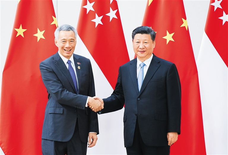 习近平指出,中新关系发展同中国改革开放息息相关。当前,中国特色社会主义进入新时代,新加坡正在实施“未来经济发展战略”。双方要结合新形势新特点,对双边关系和务实合作作出新的战略谋划和顶层设计。双方要推进政府间大项目合作。要加强“一带一路”框架内合作,继续打造好两国共建的“南向通道”,将“一带”和“一路”更好连接起来。中方愿同包括新方在内东盟国家加强沟通协调,实现“一带一路”倡议同东盟发展规划更好对接,构建更为紧密的中国-东盟命运共同体,希望新加坡发挥积极建设性作用。