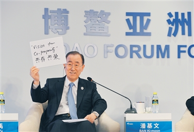 4月10日,博鳌亚洲论坛2018年年会“改革开放40年:中国与世界”分论坛在东屿岛国际会议中心举行。图为新当选为博鳌亚洲论坛理事长的潘基文,用“共存共荣”表达对中国改革开放40年的看法。