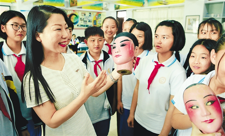 目前,该成果分别在省级平台、海口、陵水、澄迈、屯昌等区域推广,取得较好效果。今年4月,该项研究成果获海南省基础教学成果一等奖。图为海口实验中学的学生,在课堂上感受海南传统文化——三江公仔戏木偶艺术。