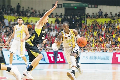 4月11日晚,在CBA半决赛抢七大战中,浙江广厦队以105:95战胜山东高速队,以总比分4:3获胜晋级总决赛。广厦队将在总决赛中对阵辽宁队。图为广厦外援福特森(右)带球突破。新华社发