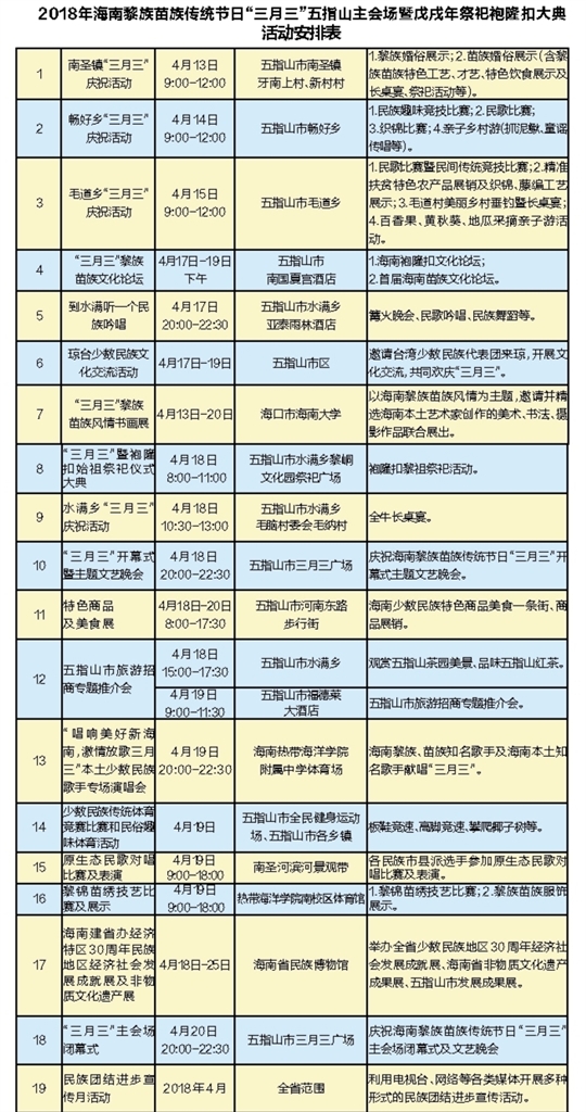 在前不久举行的2018年海南黎族苗族传统节日“三月三”活动新闻发布会上,省民宗委副主任、“三月三”活动组委会办公室副主任彭家典表示,今年“三月三”活动,主会场设在五指山市,除了开、闭幕式主题文艺晚会及黎祖祭祀大典等重头戏外,还将围绕“欢庆三月三·相约五指山”主题,举办一系列民俗文化和旅游品牌推介等共22项精彩活动。