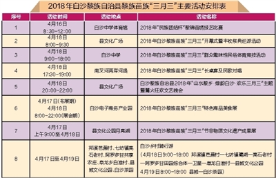 在4月18日农历三月初三当日,白沙将在上午8时举行2018年白沙黎族苗族“三月三”开幕式暨丰收祭典巡游活动,通过巡游全城的方式,点燃全城人民的节日热情。作为节日当天的重头戏之一,白沙黎族苗族“三月三”长桌宴及民歌对唱活动将于17时30分在牙叉镇的南叉河两岸铺开,届时白沙将用丰富的美食和优美的歌声欢迎远道而来的客人。在饱尝山兰美酒和黎家美食后,18日20时的“山水黎乡·绿韵白沙·欢乐三月三”主题篝火狂欢文艺晚会将盛大启幕,由当地群众自发组织编排的少数民族特色节目也会感染所有人。