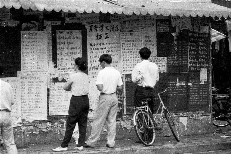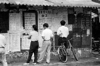 1990年,求职者在海口东湖人才市场查看招聘信息。王军 摄