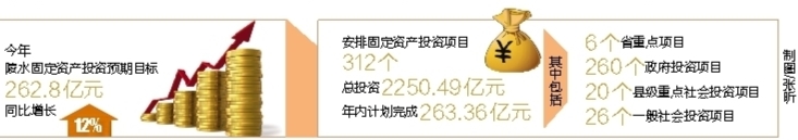 312个项目由6个省重点项目、260个政府投资项目、20个县级重点社会投资项目和26个一般社会投资项目组成,总投资2250.49亿元,年内计划完成263.36亿元。2017年,陵水完成固定资产投资234.7亿元,比上一年度增长15.7%。