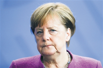 4月12日,在德国首都柏林,德国总理默克尔出席与到访的丹麦首相拉斯穆森(不在画面中)一同举行的记者会。