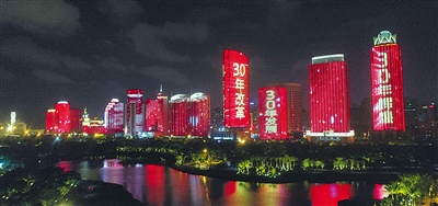 夜幕降临,滨海大道、国兴大道等高楼大厦楼宇外墙灯光绚丽多彩,“再创特区辉煌”六个灯光组成的大字令人心潮澎湃……