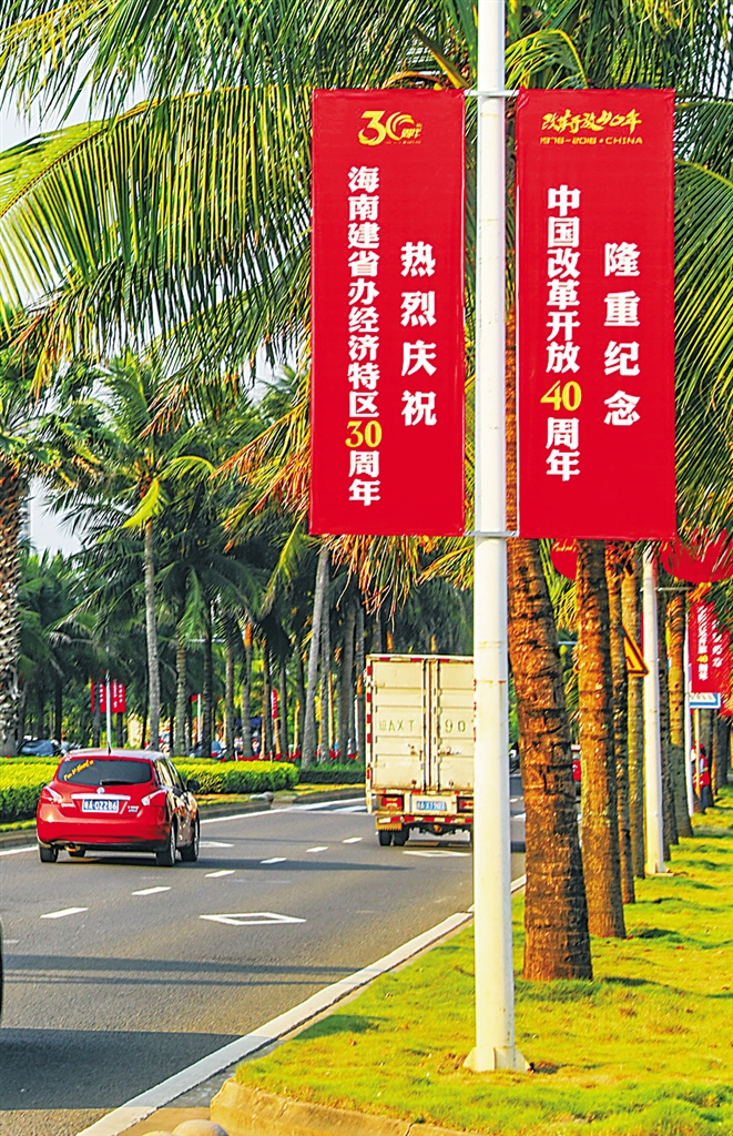 “热烈庆祝海南建省办经济特区30周年”“加快建设经济繁荣、社会文明、生态宜居、人民幸福的美好新海南”,正红色户外宣传标语简洁有力地表达了喜庆的主题……