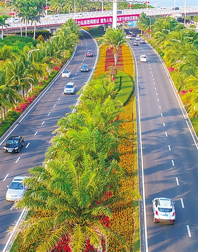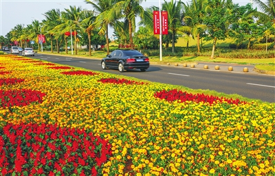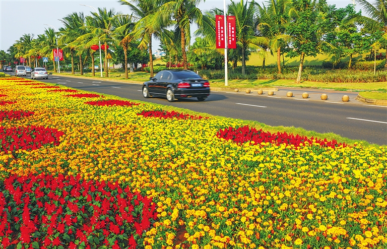 蓝天碧海映衬下,鲜花从西海岸一直伸向市区;国兴大道、三角池花团锦簇;海口火车站、各立交桥三角梅怒放;公园和街心绿地上,立体、组合花架错落有致;公交候车亭广告栏、满挂街头的大红灯笼和国旗提示了一个重大日子已经来临……