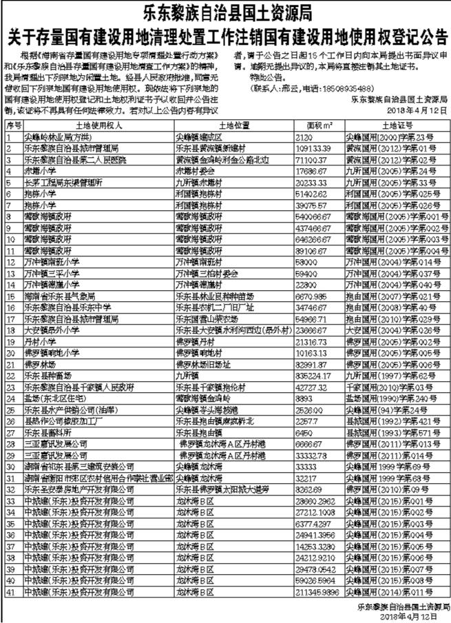 乐东黎族自治县国土资源局关于存量国有建设用地清理处置工作注销国有建设用地使用权登记公告