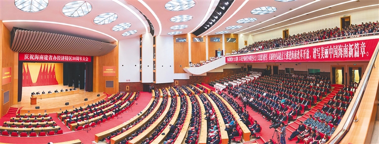 大会在雄壮的国歌声中开始。习近平发表了重要讲话。他指出,今年是我国改革开放40周年,也是海南建省办经济特区30周年。今天,我们在这里隆重集会,庆祝海南建省办经济特区30周年,就是要充分肯定经济特区建设的历史功绩,深刻总结经济特区建设的宝贵经验,在新时代新起点上继续把全面深化改革推向前进,为实现“两个一百年”奋斗目标、实现中华民族伟大复兴的中国梦提供强大动力。