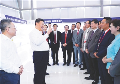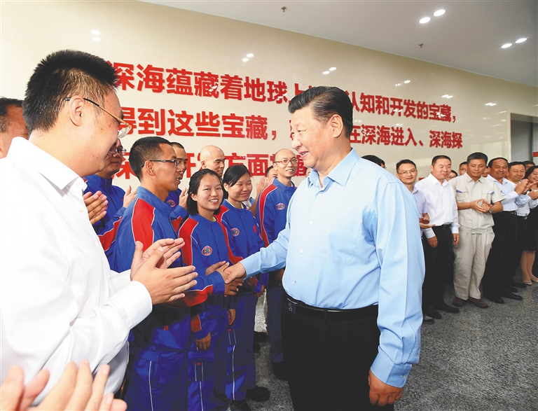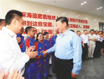 | 4月12日下午,中共中央总书记、国家主席、中央军委主席习近平在海南省三亚市考察。这是习近平在位于三亚的中国科学院深海科学与工程研究所,同“深海勇士”号载人潜水器设计师和深潜团队亲切交谈。新华社记者 李学仁 摄 |