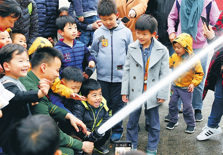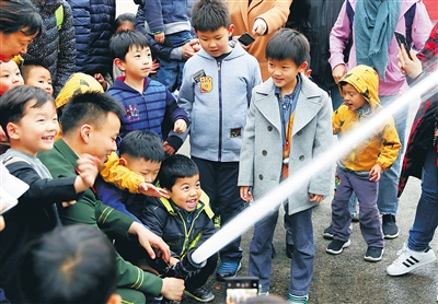 在4月15日我国第三个“全民国家安全教育日”即将来临之前,一批向社会公开招募的小朋友及其家长体验者,走进上海市消防总队闵行支队七宝中队,参观学习消防知识,了解体验消防装备,增强消防安全意识和消防应急自救能力。 新华社记者 刘颖 摄