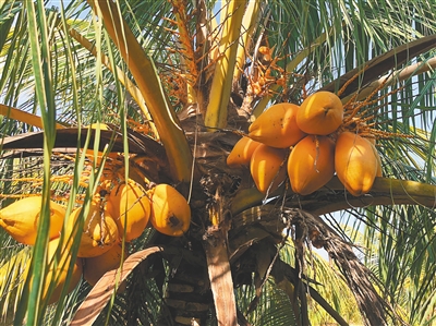 “金椰子因外表呈金黄色而得名,本地椰子的含糖量大约是4%至6%,而金椰子达到了6%至8%;一株金椰子树的年产椰子量可超百个,而普通椰树年产量只有三四十个。”东新农场公司经营管理部副经理邹青山介绍说,凭借着靓丽娇小的外形,清甜甘爽的汁水,细嫩松软的肉质,让金椰子颇受市场青睐。