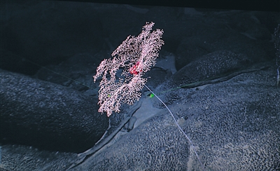 图为一株金柳珊瑚附着在麦哲伦海山的富钴结壳上。近日,中国“科学”号科考船上的“发现”号深海机器人多次深潜探访西太平洋麦哲伦海山区并采样。这里正是全球著名的“富钴结壳区”。 新华社发